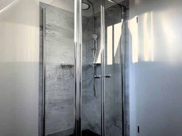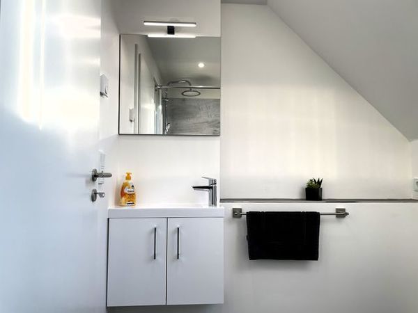 Das helle Badezimmer ist modern gestaltet und verfügt über eine bodengleiche Dusche, ein Waschbecken und ein WC, sodass Sie sich rundum wohlfühlen können.