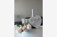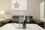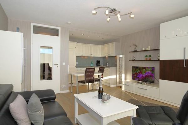 Ein moderner Einrichtungsstiel in hellen Farben erwartet Sie. Bequeme Ledersitzgarnitur, Flachbildfernseher und Radio, W'Lan sowie Eßecke am Küchentresen.