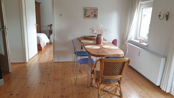 Die Wohnung erreicht man durch einen separaten Eingang vom Garten aus. Es gibt einen Flur mit Garderobe und Spiegel, ein Schlafzimmer mit einem Doppelbett und einem Einzelbett, ein Wohn- und Esszimmer mit einem ausziehbaren Sofa (2 zusätzlichen Schlafplätzen), ein großes Bad mit begehbarer Dusche und marokkanischem Flair und eine Küche mit rustikaler Anmutung und einem Herd/Ofen.