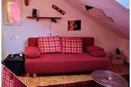Neben der parterre gelegenen 3-Zimmerferienwohnung "Landidyll" vermiete ich diese sehr gemütliche, Dachgeschosswohnung (ca.22 qm)mit einem hellen, sonnendurchflutetem Wohnzimmer. Die beiden Zimmer, getrennt durch einen Vorhang, stehen über eine "Durchsteige" miteinander in Verbindung und sind mit je einem Schlafsofa für je 1 bzw 2 Personen versehen, wobei die Liegefläche desjenigen im Schlafzimmer im 160x200cm die größere ist.