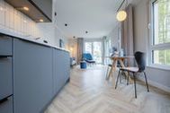 Zu zweit und umgeben von allem Komfort die Nähe zur Ostsee genießen: Dafür wurde das Ferienappartement 3 gemacht. Dort warten angenehm und modern designte Räume auf Sie. Mit einer voll ausgestatteten Küche und einem Esstisch für zwei. Der große Eckbalkon zeigt nach Südwesten, für viel Sonne. Öffnen Sie seine Schiebetüren und erweitern Sie komfortabel den Wohnbereich, der mit bequemen Sitzmöbeln und einem Flatscreen-TV für gemütliche Abende ausgestattet ist.