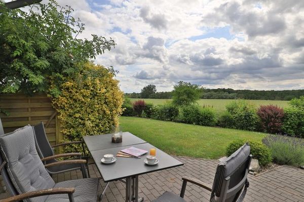 Im Erdgeschoss empfängt Sie der helle und komfortabel möblierte Wohn-Essbereich mit einem hochwertigen Sofa und einem Lehnsessel mit Beinablage. Auch ein Kaminofen lädt zur gemütlichen Auszeit ein. Am großen Esstisch mit Terrassenblick genießen Sie Ihre Mahlzeiten, die Sie in der bestens ausgestatteten Wohnküche zubereiten können. Ceranherd, Backofen, Mikrowelle, Dunstabzug, Kühlschrank mit integr. Gefrierfach, Kaffeemaschine, Wasserkocher, Toaster, Spülmaschine u.v.m. Für technische Unterhaltung stehen ein Fernseher, Musikanlage bereit und WLAN nutzen Sie ohne zusätzliche Gebühr. Auf der sonnigen Terrasse mit Strandkorb und angrenzenden Garten finden Sie Ruhe zum Entspannen. Zudem befindet sich im Erdgeschoss des Hauses ein Duschbad mit Waschtisch und WC. Über eine Treppe gelangen Sie in das Obergeschoss mit zwei Schlafzimmern und einem weiteren Badezimmer mit Wanne, Dusche, Waschtisch, Handtuchheizung, Föhn, WC. Beide Schlafzimmer sind mit einem Doppelbett, Kleiderschrank ausgestattet und bieten den Zugang zum Balkon mit Weitblick über die Felder. Für Kleinkinder stehen ein Kinderreisebett und ein Kinderhochstuhl bereit. Waschmaschine sowie Wäschetrockner, Bügeleisen und Bügelbrett befinden sich im Hauswirtschaftsraum. Das Haus lässt sich über Außenrollos verdunkeln. Mitgebrachte Fahrräder können im Abstellraum untergebracht werden. Ein kostenfreier Außenstellplatz gehört zum Ferienhaus.