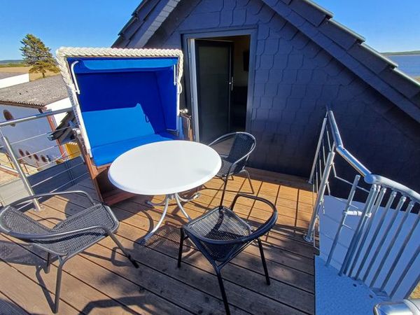Das Dachgeschoss (mit Dachschrägen) mit sep. Eingang über eine Treppe von außen ist ausgestattet mit Schlafcouch für 2 Personen, separater Küchenzeile mit 2-Platten-Herd, Kühlschrank, Kaffeemaschine, Wasserkocher sowie Toaster. Das kleine Bad verfügt über DU/WC. Auf der ca. 9 qm großen möblierten Terrasse mit Strandkorb können Sie morgens Ihren Kaffee genießen oder den Abend bei einem Glas Wein ausklingen lassen. Es stehen Ihnen 2 Pkw-Stellplätze zur Verfügung.