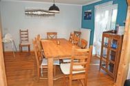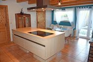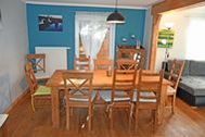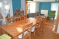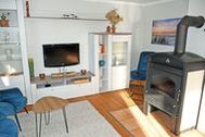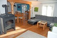 Es ist ca. 120 qm groß, hat Platz für maximal 10 Erwachsene und zwei Kinder bis 3 J. im Kinderreisebett. Im Erdgeschoss liegt der Wohnraum mit bequemer Sitzcouch mit Tisch und einem modernen Flachbild-TV-Gerät. Ein Kamin sorgt auch in der kühleren Jahreszeit für Behaglichkeit. Hier steht auch ein großer Esstisch mit Stühlen.