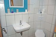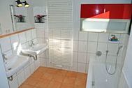 Das im Erdgeschoss liegende Bad ist mit Dusche, Badewanne, Haartrockner, WC und Waschtisch ausgestattet, es hat Fenster und Tageslicht.