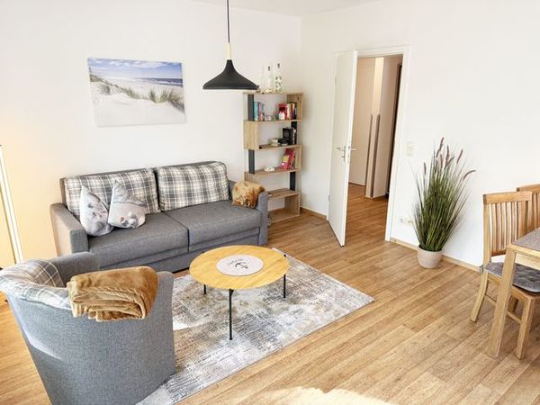 Die gemütliche ca. 52 m² große Nichtraucher-Oase der Ruhe liegt idyllisch im 1. Obergeschoss der Villa Störtebeker (Nr. 15) und bietet Ihnen für max. 2 bis 4 Personen, einen herrlichen Blick ins Grüne. Vom großen Flur aus, mit Garderobe, einem Spiegel und einem Schrank, gelangen Sie in alle Räume. Die in allen Räumen verwendeten Möbel und Accessoires strahlen Ruhe und Gemütlichkeit aus perfekt, um dem Alltag zu entfliehen. Der großzügige, lichtdurchflutete Wohnbereich lädt mit einer Essecke, einer komfortablen Schlafcouch (1,60m x 2,00m, Aufbettung für 3./4. Person), einem Sessel, einen Relaxesessel, einer Stehlampe, einem TV-Board und einem 55-Zoll-Smart-TV zum Entspannen ein. Auch bei nicht so gutem Wetter kommt keine Langeweile auf: denn Spiele, ein DAB-Radio und eine Bücherecke sorgen für zusätzliche Unterhaltung. Ein kostenfreier WLAN-Zugang ist ebenfalls vorhanden. Stilvolle, teilweise dimmbare Lampen sorgen für eine Wohlfühlatmosphäre. Vom Wohnbereich gelangen Sie auf den 10 m² große, überdachten und nach Osten ausgerichteten Balkon, umgeben von Grün und Bäumen, ist es der perfekte Ort für entspannte Stunden. Je nach Windrichtung können Sie auch das Meer zart rauschen hören. Die separate Küche ist komplett ausgestattet mit einem Cerankochfeld, einem Backofen, einem Geschirrspüler, einem Kühlschrank mit Eisfach, einer Spüle sowie weiteren Elektrogeräten wie einer Nespresso-Kaffeemaschine, einer Kaffeemaschine, einen Eierkocher, einem Wasserkocher, einem Toaster, einer Mikrowelle und einem Rührgerät/Mixer. Im geräumigen Schlafzimmer erwartet Sie ein erholsamer Schlaf in einem Doppelbett in Komforthöhe (1,80m x 2,00m) mit verstellbaren Lattenrosten. Nachttischablagen mit Beleuchtung, ein Herrendiener, ein Kleiderschrank und ein weiterer Flachbild-TV sind ebenfalls vorhanden. Die Verdunklungsmöglichkeit, sowie Insektenschutzgitter und die ruhige Lage sind beste Voraussetzungen für ruhige Nächte. Das innenliegende Badezimmer, mit einem WC, einer Dusche, einem Fön, einem Kosmetikspiegel und einem Waschplatz, bietet Ihnen den täglichen Komfort. Eine Waschmaschine und ein Trockner stehen gegen Gebühr im Waschraum zur Verfügung. Haustiere sind nicht erlaubt. Ihre Fahrräder können Sie im gemeinschaftlichen, abschließbaren Fahrradhäuschen hinter dem Haus oder im abschließbaren Keller des Hauses abstellen. Ihr PKW-Stellplatz (Nr. 15) befindet sich direkt vor dem Haus. Die Erstausstattung eines Wäschepaketes (komplette Bettwäsche, 1 Duschhandtuch, 1 kleines Handtuch) können Sie bis 14 Tage vor Anreise gegen Aufpreis dazu buchen oder durch eigene Ergänzen. Ab 2 gebuchten Paketen erhalten Sie einmalig 1 Geschirrhandtuch und 1 Duschvorleger dazu.