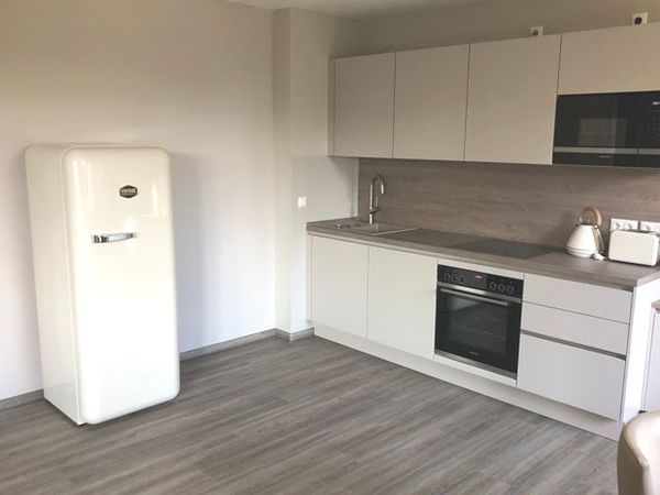 Einbauküche mit Kühlschrank/Gefrierfach, Herd mit Ceran- Kochfeld und Backofen, Spülmaschine, Mikrowelle, Kapsel- Kaffeemaschine, Wasserkocher, Toaster
