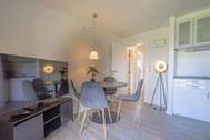 Die offene Küchenzeile ist kompakt und komplett ausgestattet: Kochfeld, Kühlschrank, Kaffeemaschine, Toaster und Wasserkocher stehen bereit ganz bewusst ohne Backofen oder Geschirrspüler, für einfache und stressfreie Selbstversorgung.