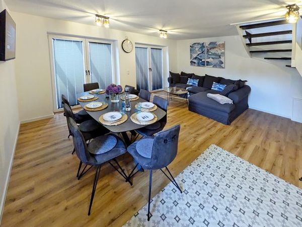 Im hellen Wohnbereich mit Smart-TV erwartet Sie eine offene, voll ausgestattete Küche samt Essbereich. Neben Filter-Kaffeemaschine, Toaster, Wasserkocher, Eierkocher, Handmixer, Backofen und Geschirrspüler, steht Ihnen auch ein großer Kühlschrank mit Tiefkühlfach zur Verfügung. Für die kleinen Gäste gibt es Kinderbett, Hochstuhl, kindgerechtes Besteck und Spielzeug.