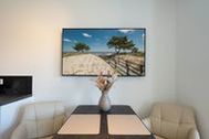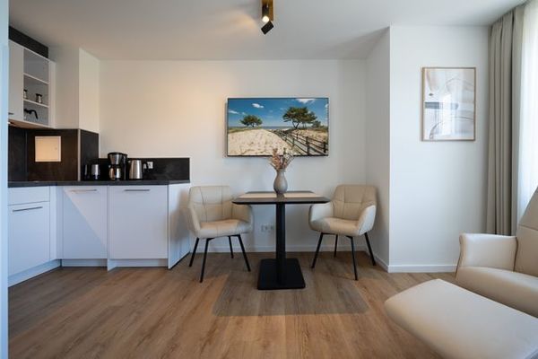 Kompakt, stilvoll, durchdacht 1-Raum-Appartement Nr. 5 für zwei in der 2. Etage.Dieses liebevoll eingerichtete 1-Raum-Appartement in der 2. Etage bietet auf 28?m² eine clevere Kombination aus Funktionalität und Wohlfühlambiente ideal für Paare oder Alleinreisende, die Wert auf Komfort legen. Der offene Wohnbereich ist hell und freundlich gestaltet. Die moderne Küchenzeile ist ausgestattet mit 2-Platten-Cerankochfeld, Spülmaschine, Kühlschrank mit Gefrierfach und Nespresso-Kapselmaschine ideal für den ersten Kaffee am Morgen oder das schnelle Abendessen. Der gemütliche Essplatz für zwei lädt zum Verweilen ein. Für entspannte Stunden stehen zwei komfortable Relaxsessel mit Hocker bereit, begleitet von einem 55-Zoll-Flat-TV falls das Meer mal Pause hat. Das hochwertige Boxspringdoppelbett (1,60?m x 2,00?m) sorgt für erholsamen Schlaf, während der Kleiderschrank ausreichend Stauraum für Ihre Urlaubsgarderobe bietet. Das kompakte Bad mit Dusche (0,85m x 0,70m), Waschtisch und WC ist gepflegt und funktional alles drin, alles dran. Ein fester PKW-Stellplatz (Nr.?5) befindet sich direkt vor dem Haus, kostenfreies WLAN ist selbstverständlich inklusive. Ein durchdachtes Refugium für alle, die es klar, gemütlich und komfortabel mögen willkommen in Ihrer kleinen Auszeit. In der Villa Elisabeth trifft klassischer Charme auf modernen Komfort ein stilvoller Ort zum Ankommen und Durchatmen. Das liebevoll gepflegte Haus beherbergt insgesamt zehn geschmackvoll eingerichtete Appartements: drei kompakte 1-Raum-Appartements sowie sieben gemütliche 2-Raum-Appartements jeweils ideal für zwei Personen. Vier der Wohnungen verfügen über einen sonnigen Süd-Ost-Balkon perfekt für einen entspannten Start in den Tag mit frischer Luft und Kaffeetasse oder für eine kleine Auszeit zwischendurch. Im Souterrain steht den Gästen eine gemeinschaftlich nutzbare Trockensauna mit Ruhebereich täglich im Zeitraum von 14:00 bis 22:00 Uhr zur Verfügung und kann in diesem Zeitfenster für bis zu zwei Stunden am Stück genutzt werden. Danach schaltet sie sich automatisch ab ideal zum Abschalten nach einem langen Tag. Ebenfalls dort: ein Hauswirtschaftsraum mit Münz-Waschmaschine und -Trockner. Zu jeder Wohnung gehört ein fester PKW-Stellplatz vor dem Haus oder auf dem Hof. Direkt neben dem Haus lädt ein überdachter Sitzplatz mit Grillmöglichkeit zum geselligen Beisammensein ein ob beim gemütlichen BBQ oder einem entspannten Glas Wein. Praktisch und durchdacht: Briefkästen befinden sich gut erreichbar direkt am Haus. Villa Elisabeth Ihre stilvolle Auszeit mit allem, was dazugehört.