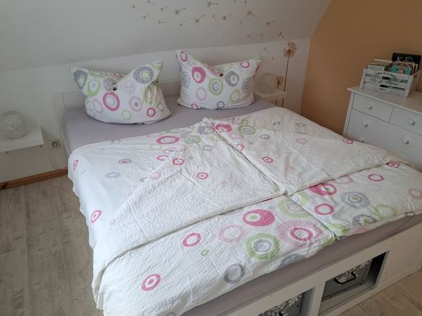 Im Dachgeschoss (Raumspartreppe) befinden sich zwei weitere Schlafmöglichkeiten für Kinder oder Erwachsene. Das Daybett ist zum Doppelbett ausziehbar (Liegefläche 2 x 90 x 200 m). Weiterhin befindet sich im DG neben einer Wäschekomode, Kleiderhaken und eine Sitzmöglichkeit.