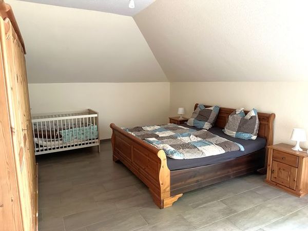 Die Ferienwohnung im Obergeschoss verfügt über eine voll ausgestattete Küche, ein gemütliches Wohnzimmer mit einer Schlafcouch (1,40 x 2,00m), einem Doppelzimmer (Doppelbett 1,80m x 2,00m mit 2 Matratzen) und ein Kinderbett/Gitterbett (0,70 x 2,00m), einem Mehrbettzimmer mit Doppelbett (Doppelbett 1,40m x 2,00m) und einem Einzelbett/Etagenbett (0,90m x 2,00m). Bei dem so bezeichneten Einzelbett/Etagenbett, handelt es sich um ein Bett und einem zusätzliches Bett (0,90m x 2,00m), dass sich aus dem Bettkasten herausziehen lässt). Das großziges Bad ist ausgestattet mit einer Badewanne, einer ebenerdigen Dusche und zwei Waschtische.