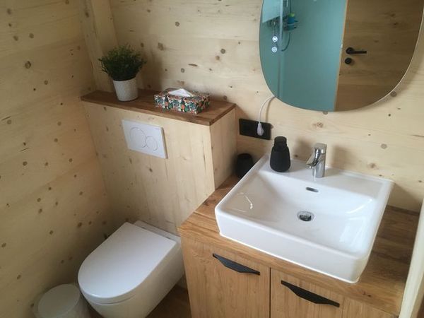 Das ökologische Holzhaus überzeugt mit einer liebevoll gestalteten, gemütlichen Einrichtung, die eine warme Wohlfühlatmosphäre schafft ideal zum Entspannen und Abschalten. Die nach Süden ausgerichtete Terrasse lädt mit einem Tisch und bequemen Stühlen zu erholsamen Stunden im Freien ein ob beim Frühstück in der Morgensonne oder beim Abendessen an der frischen Luft. Das Schlafzimmer ist mit einem komfortablen Doppelbett (180x200cm) ausgestattet, während zwei weitere Einzelbetten (je 90x200cm) im zweiten Schlafzimmer ebenfalls erholsamen Schlaf versprechen.Alle Räume befinden sich ebenerdig und sind schwellenfrei zugänglich. Im gesamten Haus gilt ein absolutes Rauchverbot.