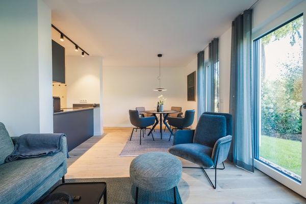 Willkommen in Ihrem exklusiven Ferienappartement in Zingst, im Grünen Weg 7 einem neu erbauten Refugium (Fertigstellung 2025), das durch sein stilvolles Design, seine erstklassige Ausstattung und die unvergleichliche Lage begeistert. Dieses hochwertige 2-Zimmer-Appartement bietet auf etwa 60 m² modernen Wohnkomfort in bester Lage. Großzügige Fensterfronten durchfluten den Wohnbereich mit Licht und eröffnen den Blick in den liebevoll gestalteten Garten. Die angrenzende West-Nord-Terrasse lädt zu entspannenden Momenten oder gemeinsamen Mahlzeiten im Freien ein.