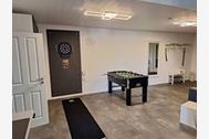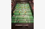 Freizeitraum mit hochwertiger Schlafcouch, Dartscheibe und Tischkicker