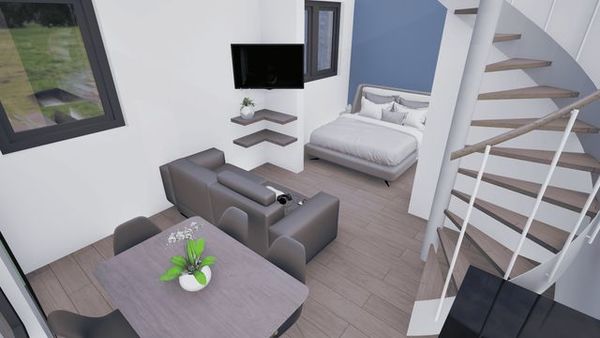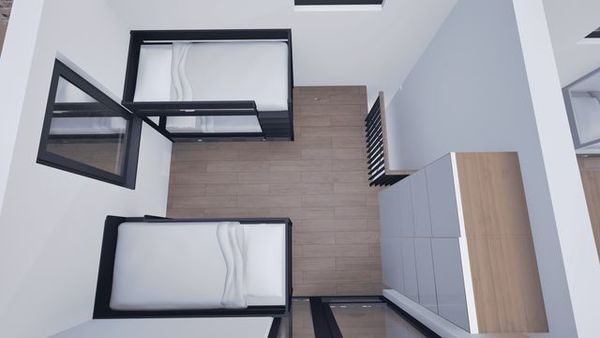 Das Tiny Haus "Dorfmitte" bietet Platz für bis zu sechs Personen und überzeugt durch einen modernen Urban-Einrichtungsstil. Im Erdgeschoss befindet sich ein Schlafzimmer mit einem Doppelbett inklusive Stauraum, Nachttischen und Kleidergarderobe. Im Obergeschoss stehen zwei Stockbetten mit Nachttischen und Kleiderschrank bereit. Bettwäsche ist für alle Schlafplätze vorhanden.