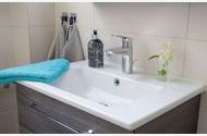 Das großzügige Bad mit großzügigem Waschtischmöbel, Fön, Hygieneartikel und Dusche runden das Gesamtbild. Das WC befindet sich in einem separaten Raum.