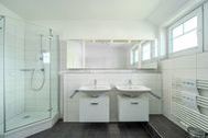 Über die Wendeltreppe erreichen Sie das Obergeschoss mit drei Schlafzimmern: zwei davon mit Doppelbetten (180x200), Fernseher und Kleiderschrank, das dritte mit einem 140x200-Bett. Das helle Badezimmer überzeugt mit anthrazitfarbenen Fliesen, Fußbodenheizung, zwei Waschbecken, Dusche und Badewanne ideal für entspannte Wellnessmomente. Natur und Aktivitäten