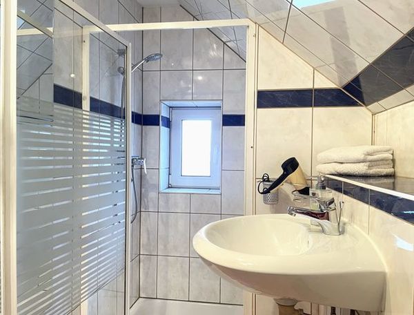 Das helle Bad ist modern ausgestattet mit einer begehbaren Dusche, Waschbecken und WC. Ein Handtuchwärmer und ein großer Ganzkörperspiegel runden den Komfort ab.