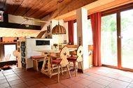 Im Erdgeschoss befindet sich ein großer, offener Wohn-Ess-Bereich auf zwei Ebenen mit Panoramafenstern, zwei Sitzecken, zwei Esstischen, zwei Kachelöfen und einem Kamin (hier muss im Winter selbst mit Holz geheizt werden) und Zugang zur sonnigen Terrasse, eine vollausgestattete Küche mit Spülmaschine, ein WC und ein Schlafzimmer mit 2 Doppelbetten und eigenem Bad mit WC und Dusche.