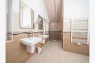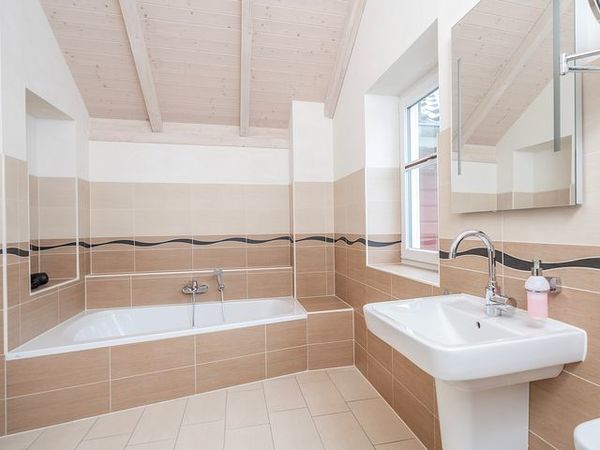 Im Obergeschoss befindet sich das Wellnessbad mit großzügiger Sauna und einer XXL-Badewanne für zwei Personen. Ein weiteres Bad im Erdgeschoss ist barrierearm gestaltet und mit einer bodengleichen Dusche ausgestattet. Dort liegt auch ein Einzelzimmer mit 1,20 m breitem Komfortbett, während im Obergeschoss zwei weitere Schlafzimmer mit Doppelbetten zur Verfügung stehen.