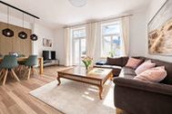 Die großzügige und sehr geräumige Wohnung bietet ein elegantes Schlafzimmer, ein lichtdurchflutetes Wohnzimmer sowie eine großzügigen Essbereich mit schwerem, einladendem Tisch ideal für gemeinsame Abende. Die Wohnbereiche verfügen über viele Fenster und schaffen so eine helle, offene Atmosphäre.