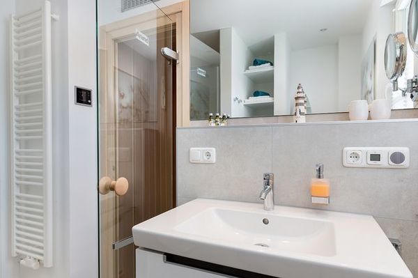 - Badezimmer: Zwei moderne Bäder eines mit Dusche, das andere mit ebenerdiger Regendusche und großzügiger Sauna