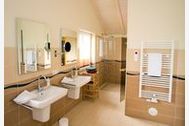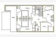 Im Obergeschoss erwartet Sie ein großzügiges Wellnessbad mit XXL-Badewanne, Dusche und Sauna. Zwei Schlafzimmer mit Doppelbetten und Zugang zum Balkon bieten Rückzugsorte mit Ausblick.