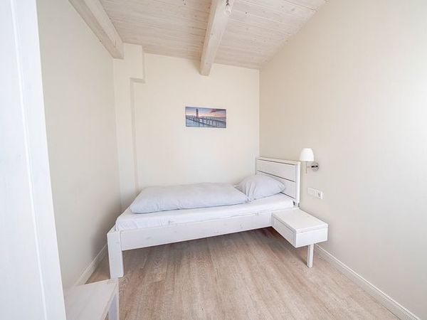 Im Erdgeschoss befinden sich ein Schlafzimmer mit komfortablem Einzelbett sowie ein Bad mit schwellenloser Dusche ideal für Gäste, die Treppen vermeiden möchten. Im Obergeschoss erwarten Sie zwei weitere Schlafzimmer sowie ein großzügiges Wellnessbad mit XXL-Badewanne für zwei Personen und einer geräumigen Sauna.