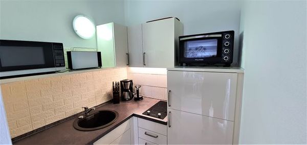 Voll ausgestattete Einbauküche mit Geschirrspüler, Kühlschrank, Herd, Mikrowelle u.v.m.