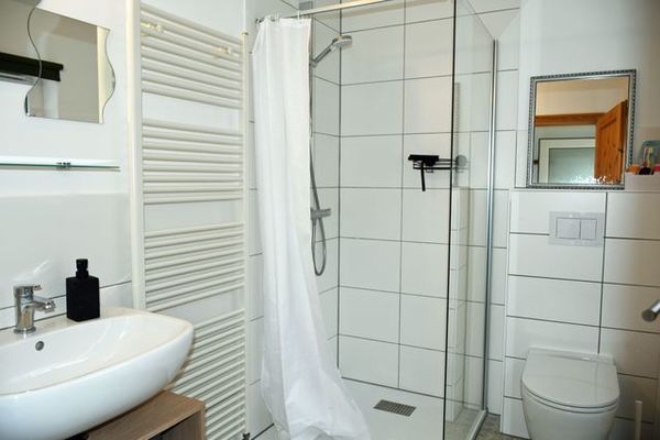Das moderne Bad ist mit Dusche, Haartrockner, WC und Waschtisch ausgestattet, es hat Fenster und Tageslicht.