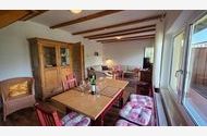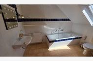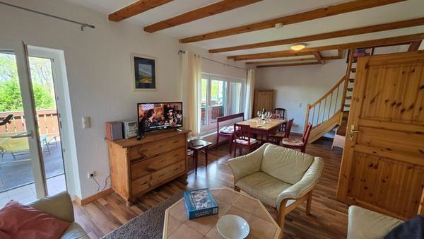 Die Ferienwohnung 4 mit befindet sich in der Ferienanlage "Haus am See" mit 100 qm auf 2 Etagen (Obergeschoss: Wohnzimmer mit Essplatz, große separate Küche, Gäste-WC mit Dusche, Dachgeschoss: 2 Schlafzimmer mit Doppelbett, 1 Schlafzimmer mit 2 Einzelbetten, Bad/Wanne/WC, ). Aus dem Wohnzimmer gelangt man direkt auf den großen Südwest-Balkon. Vom Balkon gelangt man über eine Spindeltreppe in den Garten.