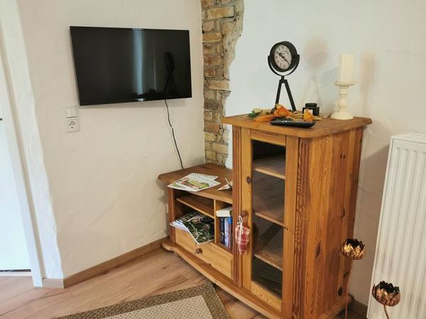 Passend zum Namen ist es ein ländliches Zweibettzimmer, mit einem gemütlichen Doppelbett (1,80×2,00 m). Sie können von diesem Zimmer aus dem Bett heraus in den Wald schauen. Gern können Sie sich auch auf die 60 cm tiefe Fensterbank setzen und dabei ein Buch lesen oder einfach nur in den Wald schauen und die Seele baumeln lassen. Das Zimmer folgt dem Landhausstil mit rustikalem Einfluss, welcher zum Beispiel durch einen alten Balken um 1850 zum Vorschein kommt. Es wird teilweise originales, altes Sichtmauerwerk gezeigt.