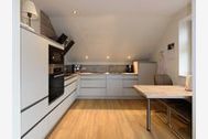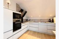 Moderne Küche mit Miele-Einbaugeräten sowohl Siebträger- als auch herkömmliche Kaffeemaschine Eier- und Wasserkocher, Mixer komplettes Koch- und Backgeschirr kleiner Tisch mit Sitzmöglichkeit für 2-3 Personen