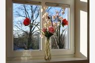 Alle Fenster mit Plissees, im Schlafzimmer mit Verdunkelungsvorhängen