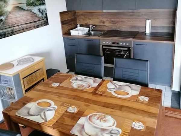 Die Ferienwohnung verfügt über einen Wohn- und Essbereich mit integrierter voll ausgestatteter Küchenzeile (Backofen, Ceranfeld, Kühlschrank, Kaffeemaschine, Wasser- und Eierkocher, Toaster, etc.).