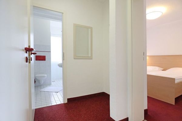 Zimmer 202 (22m²) für 2 Personen, liegt im 1. Obergeschoss und bietet ein Doppelbett, einen Kleiderschrank, Fernseher, Sitzgelegenheit sowie ein Tageslicht-Duschbad mit ebenerdiger Dusche, Waschtisch und WC. Ein öffentlicher, kostenpflichtiger Parkplatz befindet sich in ca. 500 m Entfernung.