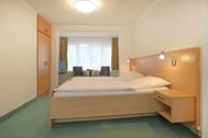 Zimmer 211 Familienzimmer (28m²) für 3 Personen, liegt im 1. Obergeschoss und bietet ein Doppelbett, eine separate Schlafkoje mit Einzelbett. Kleiderschrank, Fernseher, Sitzgelegenheit sowie ein innenliegendes Duschbad mit höherem Duscheinstieg, Waschtisch und WC.