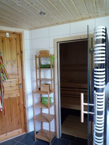 hochwertigen Ferienhauses ist die separat eingebaute Sauna im Badezimmer für wohltuende Stunden.