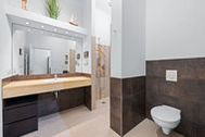 Das Badezimmer ist modern gestaltet und überzeugt mit einer ebenerdigen, begehbaren Dusche, die Komfort und Eleganz verbindet. Hier starten Sie entspannt in den Tag oder lassen ihn wohltuend ausklingen.