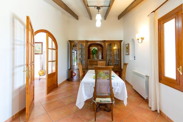 Die voll ausgestattete Küche mit Backofen, Kühl-/Gefrierschrank, Mikrowelle, Kaffeemaschine, Toaster, Wasserkocher und komplettem Kücheninventar ist offen mit dem gemütlichen Wohn- und Essbereich verbunden. Dieser verfügt über Klimaanlage, Kamin und Satelliten-TV. Traditionelle mallorquinische Details wie Holzbalken verleihen dem Haus besonderen Charme und eine warme Atmosphäre.