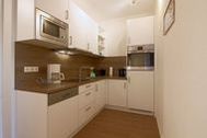 Offene Küche mit Spülmaschine, Backofen, Herd, Mikrowelle, Kühlschrank mit Gefriermöglichkeit