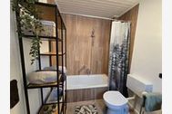 - Badezimmer mit Duschwanne, Wc, Waschbecken, Föhn, Regal mit Handtüchern usw.