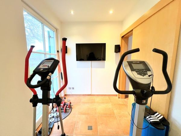 Im Erdgeschoss erwartet Sie ein offen gestalteter Wohn- und Küchenbereich mit viel Platz zum gemeinsamen Kochen und Entspannen. Ein Gaskamin sorgt für eine angenehme Atmosphäre. Ergänzt wird das Raumangebot durch einen ca. 15 m² großen Wintergarten, einen Fitnessraum sowie eine kleine Büroecke. Zusätzlich steht im Erdgeschoss ein Gäste-WC mit Waschbecken zur Verfügung.