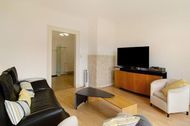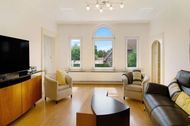 Große Fenster lassen viel Tageslicht ins Wohnzimmer strömen und bieten einen herrlichen Blick auf den weitläufigen Gemeinschaftsgarten, der sich direkt vor der Villa erstreckt.