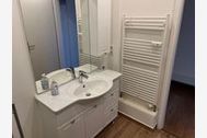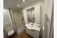 Das helle Duschbad ist vom kleinen Flur aus zu erreichen. Die moderne Waschtischkombination bietet viel Platz und einen großen Spiegel.