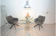 Wohnzimmer: 2 Stühle, Esstisch, Eckcouch, Couchtisch, Flachbildschirm, Kabel-TV, TV-Unterschrank, Glasvitrine, Stehlampe, Kommode, Plissees