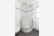 Badezimmer mit Dusche, Waschtisch und WC, Terrasse (Sitzgruppe im Garten), optimal für 2 bis 4 Personen.