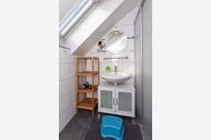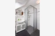 Badezimmer mit Dusche, Waschtisch und WC, Obergeschoss, Terrasse (Sitzgruppe im Garten), optimal für 2 bis 4 Personen.