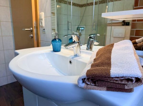 Badezimmer mit Dusche, Handtuchtrockner und Fön. WLAN und Parkplatz sind inklusive, Grillplatz mit Sitzgruppe, Haustiere willkommen (5,- Euro p. Tag und 20,00 Euro Haustierendreinigung einmalig).